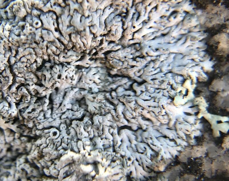 Whitish thallus of narrow lobes up to 0.5 mm wide, often forming small rosettes; lobe tips often gray, & older lobes sometimes bumpy; black apothecia with thick white thalline margins dotting older parts of thallus; lower surface white with pale rhizines; FIELD ID: a careful look is required to confirm no soredia are present