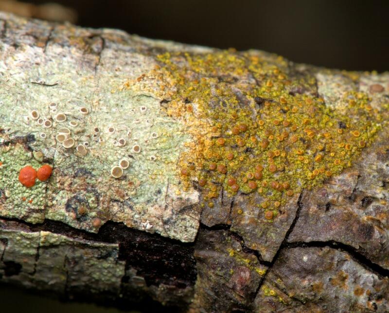 Obscure yellow or greenish smooth thallus with tiny bright orange apothecia, the rims often paler than the disk; thalli often minute & sparsely fertile (rarely densely fertile as in photo); FIELD ID: unmistakable with careful observation, once you train yourself to see the tiny smudges of yellow with orange dots