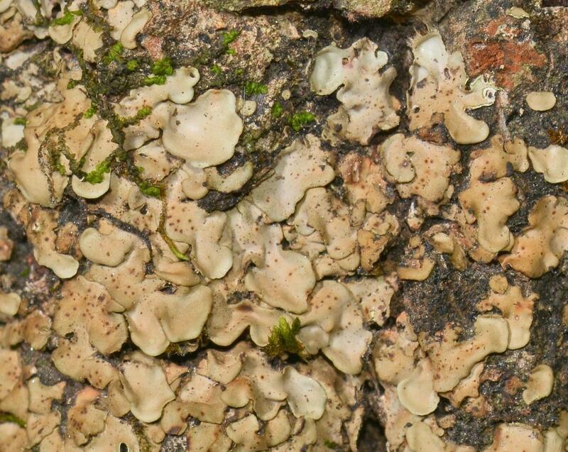 Squamules rounded or lobed, green when damp, tan or brown dry, 2-5 mm in diameter, edges slightly curled over; older squamules dotted with black-brown perithecia; FIELD ID: unmistakable