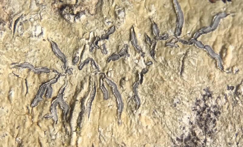 Pale green to white thallus with broad, gray-pruinose lirellae clumped into loose groups or scattered; lirellae erumpent with thallus lapping up to or above thick, dark gray to black rims; MICROSCOPY: spores brown, densely muriform, hymenium inspersed with oil droplets, exciple carbonized at 2 apices or laterally to near base; FIELD ID: requires dissection to distinguish from lookalikes