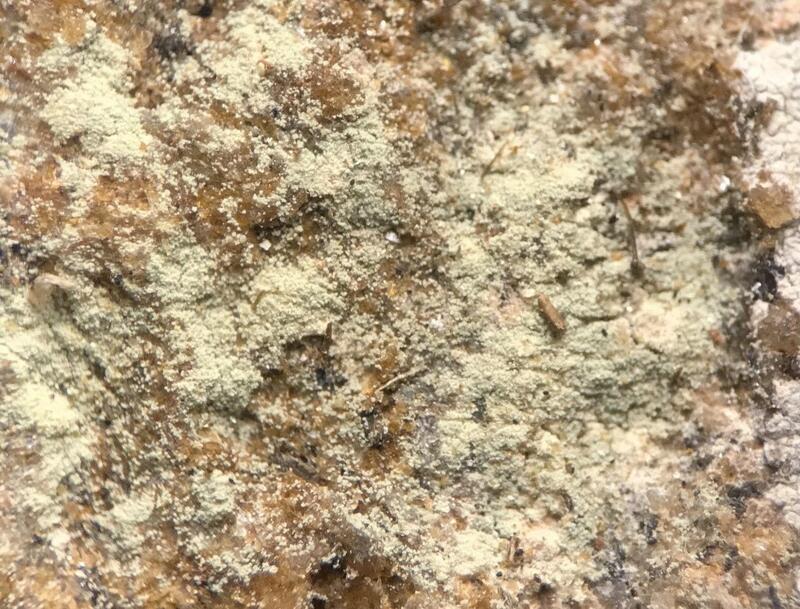 Pale, lemon-yellow to chartreuse, leprose thallus (dulling in older specimens as above) composed of fine, discrete granules, either in a continuous sheet that can crack, or scattered over rock surface singly or in small groups; fertile thalli with orange apothecia (not seen in Ga.); CHEMISTRY: thallus UV+ orange (rhizocarpic acid); FIELD ID possible with experience, given a careful look to assess granule size & a field UV test