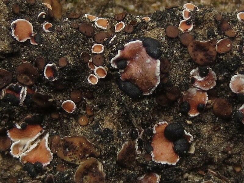 Squamules reddish to orange-brown, flat to convex, 1-6 mm in diameter, pruinose at edges or at least margins; apothecia black, along the edges of some squamules; FIELD ID possible, taking care to eliminate 2 congeners
