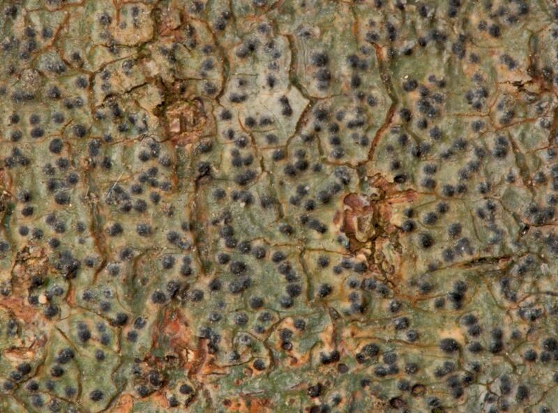 Greenish-gray to tan thallus; solitary black perithecia with apical ostioles, with variable thalline covering over base of warts but always with some black exposed at apex; MICROSCOPY: hymenium clear (not inspersed with oil droplets) & staining orange in iodine solution, spores brown, 4-celled, lacking a gelatinous sheath with dark caps, spores 27-38 x 12-18 µm; CHEMISTRY: thallus UV-; FIELD ID: dissection recommended