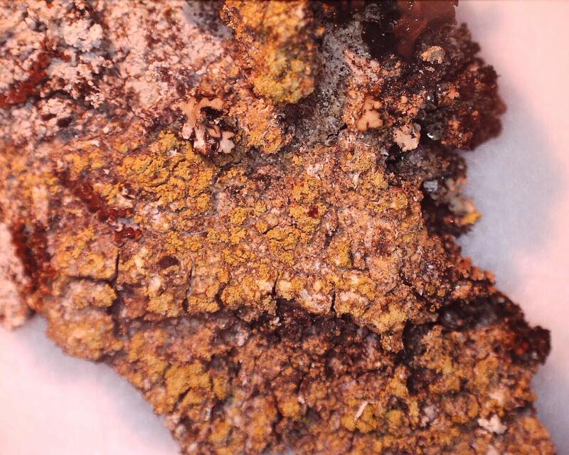 Thin, pale, green-gray continuous thallus, with irregular deep-yellow to yellow-orange soralia erupting through; chemistry: soralia K+ purple