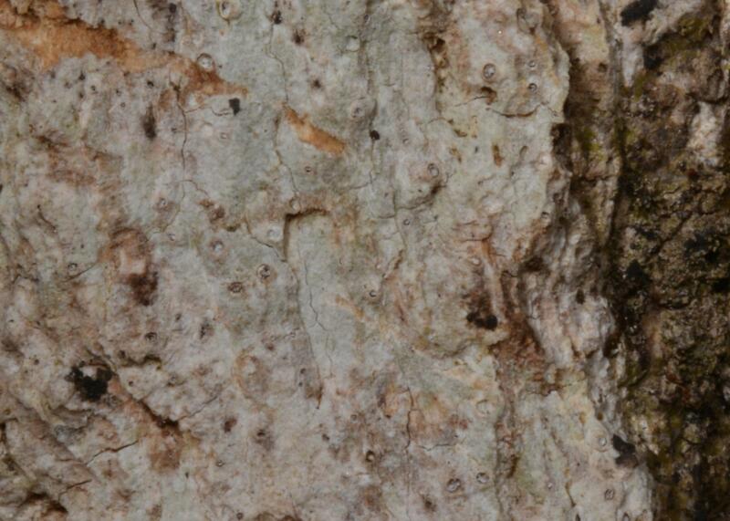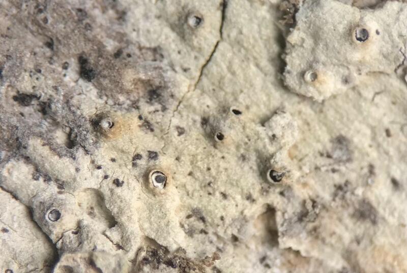 Pale green thallus, corticate; apothecia 0.2-0.5 mm in diameter, immersed in pores, thallus around pores usually raised, either conical or mounded, sometimes nearly flat; exciple usually free & visible as a thin, irregular membrane within each pore; disks gray- to white-pruinose; MICROSCOPY: spores brown, densely muriform, >100 µm long, 1/ascus; FIELD ID: dissection required