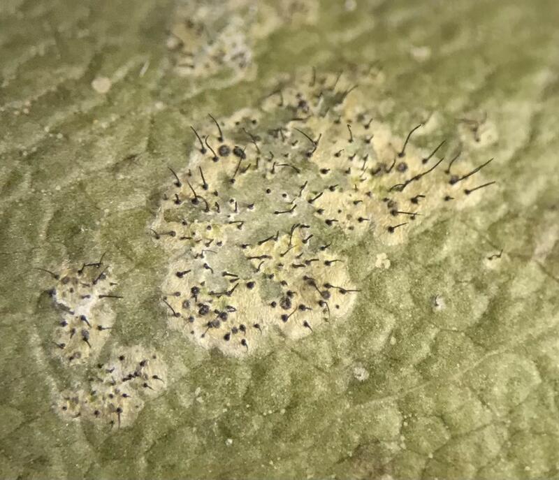 Minute green thallus, patches from about 0.5 mm in diameter sometimes merging into larger thalli several mm across; erect black setae abundant, without hyphophores broadened into blades near the top; apothecia not seen; FIELD ID possible, but best examined under dissecting scope to see minute structures