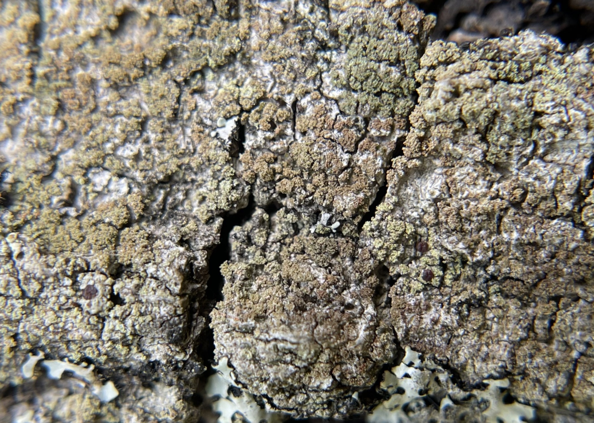 Pale continuous thallus with a mix of green, yellow, orange & brown soralia, sometimes crowded; apothecia occasionally seen, flat to puffy, glossy, chestnut-brown; CHEMISTRY: thallus K+ red (norstictic acid); FIELD ID: unmistakable within range & with some experience