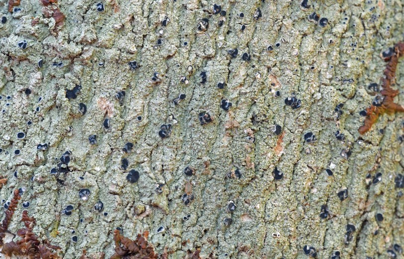 Corticolous crustose lichenized fungus, photobiont a chlorococcoid green alga